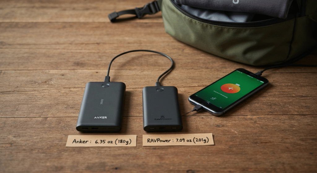 - The Contenders: I chose the 10,000mAh capacity. For me, this is the sweet spot. A 5,000mAh bank often isn’t enough, and a 20,000mAh brick is just too heavy for minimalist travel. I bought the Anker PowerCore 10000 and a comparable RAVPower 10000mAh model.